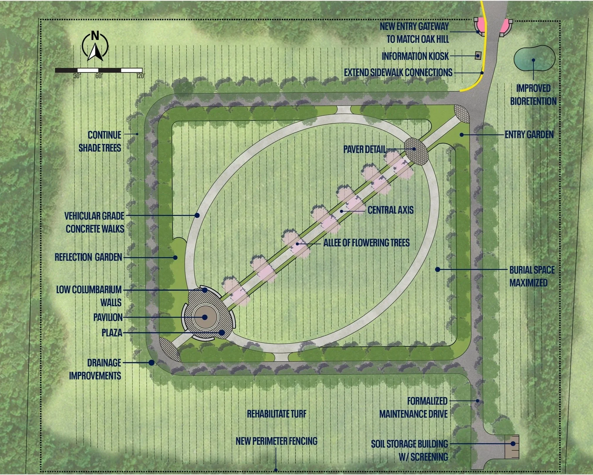 The Newnan is a rapidly growing community in the southern Atlanta metropolitan area. Sustained population growth over the past decade—and projections indicating continued expansion—have prompted city leaders to proactively plan for the long-term stewardship and development of municipal assets, including the City’s cemeteries. The City maintains four municipally owned cemeteries: Eastview, Eastview Annex, Oak Hill, and Farmer Street. Each site presents distinct operational, infrastructural, and spatial considerations, from maintenance protocols and circulation systems to capacity and expansion potential. This project responds to those site-specific conditions while establishing a cohesive visual and operational framework that unifies all four cemeteries under a consistent municipal standard.